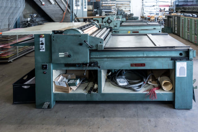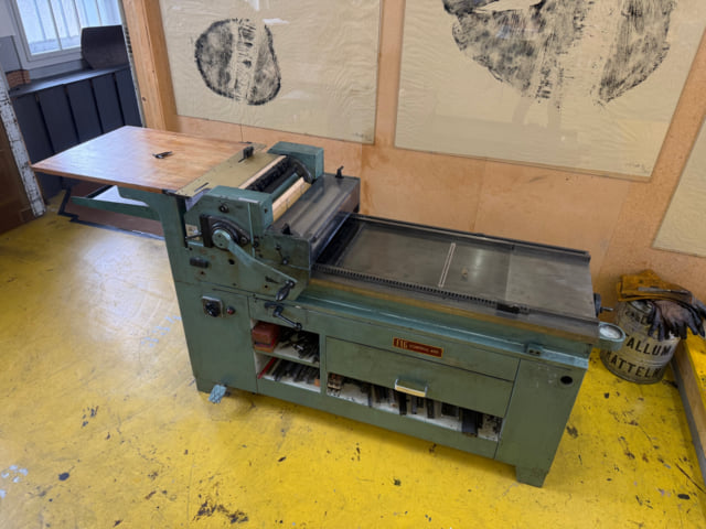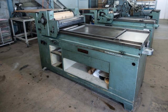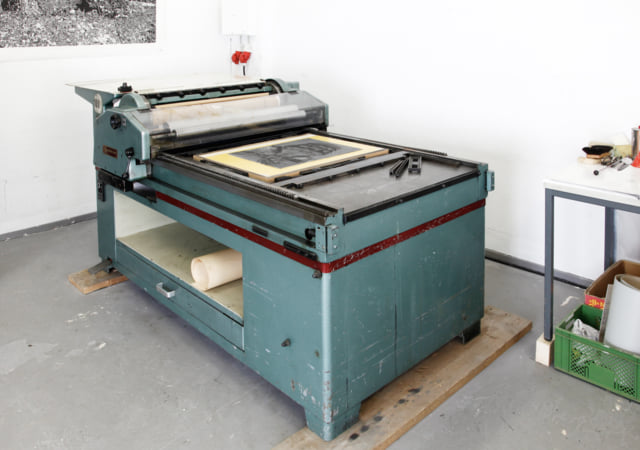 ‹I acquired this press 2021 from Dafi Kühne. This press is my workhorse for larger editions. My mechanic had to adjust the cylinder control several times, which wasn't easy. Now it prints very clean and reliable.›