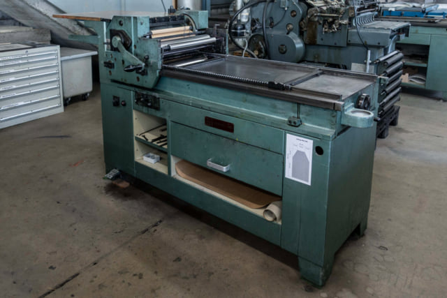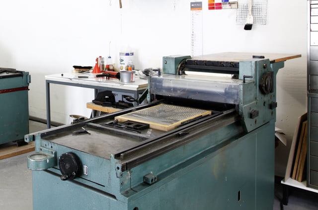 Christian Zickler on the FAG Control 525-MRS  ‹Introductory courses for students in letterpress printing are held at the machine twice a year, with a focus on cliches (Nyloprint polymer plates) and woodblock printing.›