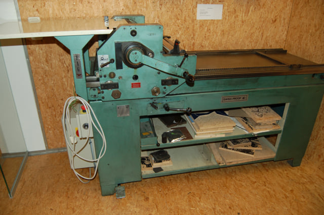 Les Ellis on the FAG Swiss Proof 40  ‹It is used for teaching people who wish to learn letterpress printing. When they are proficient, such people use the press to print art, art booklets, poem books whenever they book the facilities. The press can be used on several days or evenings and at present a week long summer school is taking place.›
